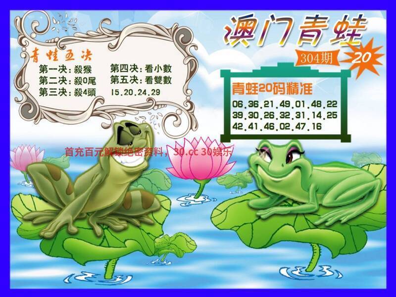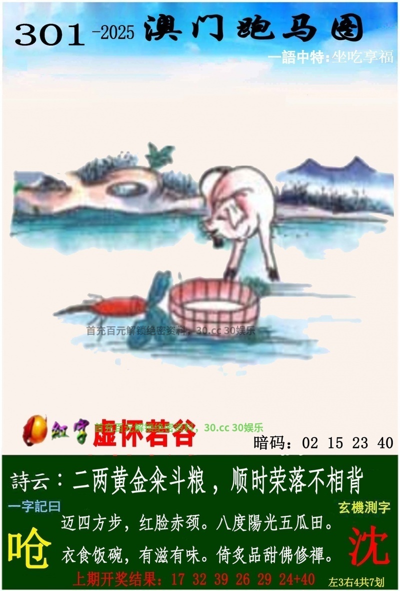 301期:澳门传真: 今期生肖二六开,二三组合有玄机。 大闹天宫齐大圣,两肖相冲出真码。 嫦娥玉兔来探望,好了疮疤忘了痛。 六合人生一五追,鹤立鸡群令人钦。 超群出众 今期生肖二六开,解双肖虎鼠狗猴马龙。大闹天宫齐大圣,解凶丑生肖鼠牛虎猴狗猪。 综合:猪马兔鸡狗虎龙蛇牛 |